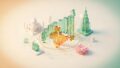 半導体セクターの成長を象徴する、マイクロチップとシリコンウェハーを中心とした等角投影図(アイソメトリック)の3Dイラスト。半透明なブルー、コーラルピンク、オレンジのガラス素材で構成されたサーバーラックやデータセンターが、光り輝く回路網で接続され、周囲を右肩上がりのミントグリーンのグラフが囲んでいる、清潔感のある近未来的なデザイン インデックスファンド