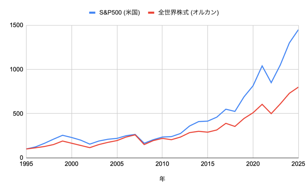 では、なぜ多くの人がS&P500を推すのでしょうか? それはシンプルに、「過去30年以上の実績において、米国株が全世界株を圧倒しているから」です。